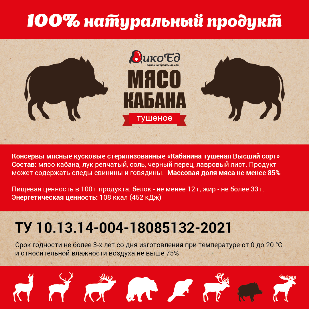 Приобретение тушеного мяса кабана (в металлической банке) рекомендуется тем, кто собирается в поход или планирует провести время на природе с семьей. Этот продукт готов к употреблению или может быть использован для приготовления различных блюд, таких как супы, каши, жаркое. В составе угощения натуральное мясо, овощи, соль и перец. Тушеное мясо кабана сохраняет свои качества длительное время без необходимости соблюдения определенной температуры хранения. Это особенно удобно во время длительных поездок на автомобиле или пеших прогулок. Продукт можно употреблять сразу после открытия банки, однако многие предпочитают подогреть его на костре.